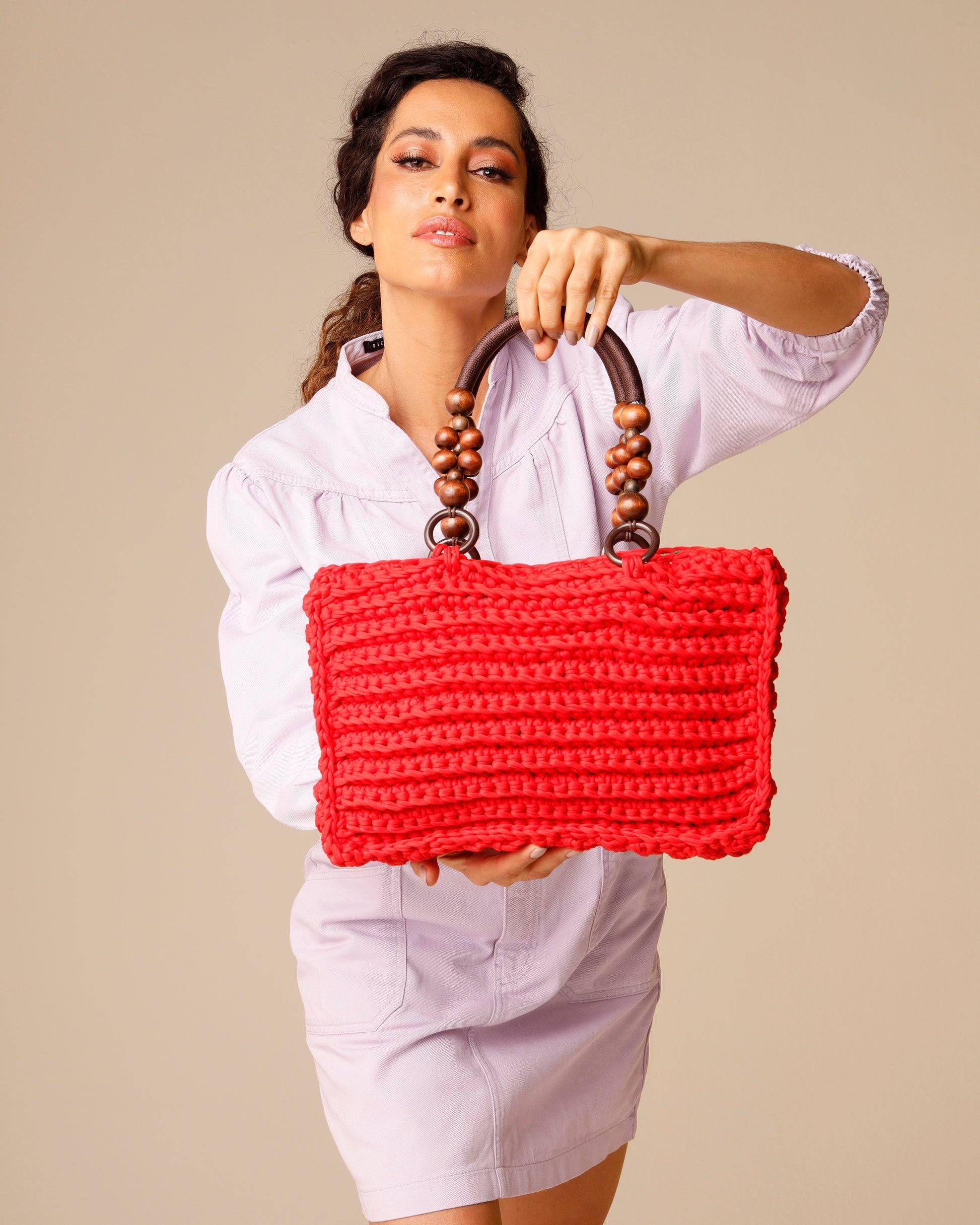 Bolsa de crochê no fio de malha, com fecho de zíper, forro interno, bolso interno com zíper, alça de ombro de corda com detalhes de bambu