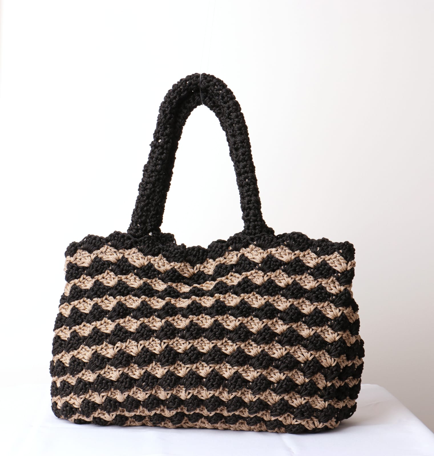 Bolsa de crochê, bicolor, alça de ombro de crochê, fecho de zíper, forro interno, bolsos internos, base estruturada