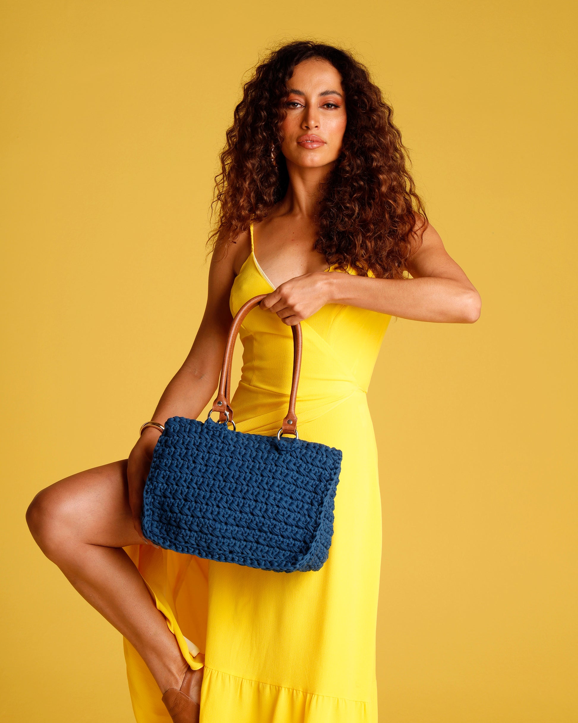 Bolsa de crochê, feita com fio de malha, alças de ombro de couro, fecho de zíper, forro interno, bolso interno com zíper