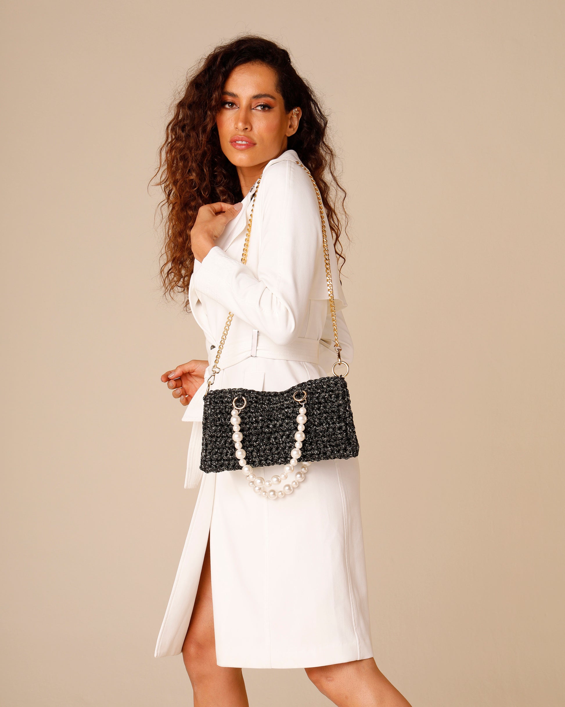 Bolsa de crochê com dupla alça, sendo uma de ombro em resina e a segunda de mão em bolas de murano ou peroladas. Fio pode conter brilho, sob demanda.